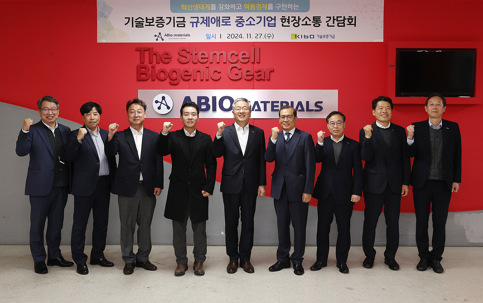김종호 기술보증기금(기보) 이사장은 27일 경기도 용인시 기흥구에 위치한 글로벌 바이오 화장품 제조기업 ㈜에이바이오머티리얼즈를 방문하여 현장 애로사항을 청취하고, 성남시 혁신지원센터장과 함께 불합리한 규제 개선 방안을 논의했다고 밝혔다.