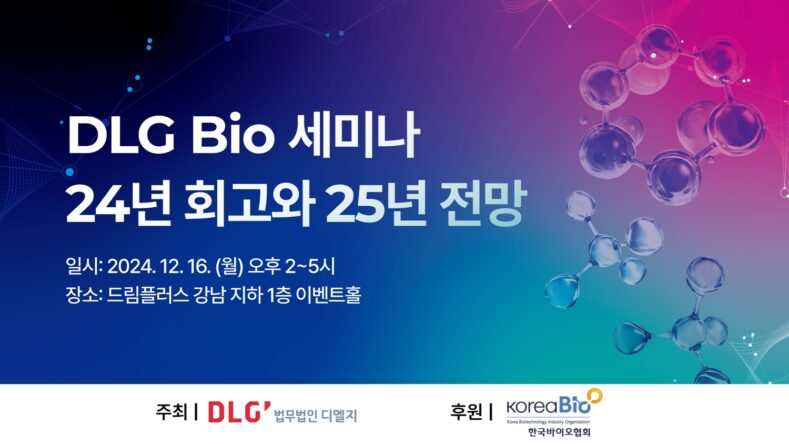 법무법인 디엘지(구 법무법인 디라이트∙대표변호사 조원희)가 오는 16일 드림플러스 이벤트홀에서 ‘바이오 산업, 24년 회고와 25년 전망’ 세미나를 개최한다고 2일 밝혔다.