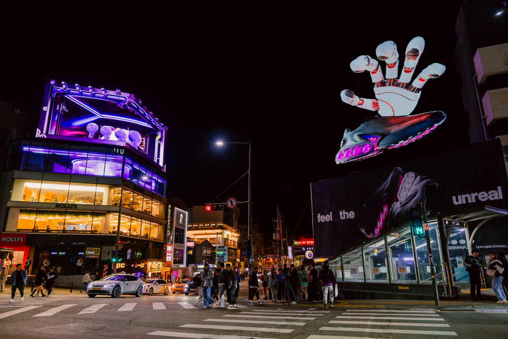 이번 이벤트는 5개의 옥외 매체를 결합해 나이키 에어맥스Dn만을 위한 압도적인 무대를 선보였으며, 건물 옥상에 설치된 대형 스크린을 통해 공중에 떠 있는 듯한 시각적 효과를 연출하고, 유리창에 부착된 LED 스크린과 주변 건물의 전광판, 파노라마 스크린, 외벽 랩핑을 통해 거대한 미디어 공간을 창출했다.