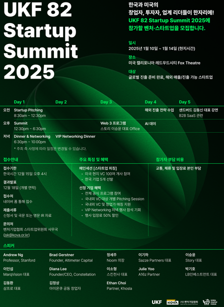 ‘UKF 82 Startup Summit 2025’는 글로벌 스타트업 및 투자자들이 한자리에 모이는 행사로, 내년 1월 10일부터 14일까지 미국 캘리포니아 레드우드시티의 Fox Theatre에서 개최된다. 이 행사는 글로벌 한인 창업자 네트워크인 UKF(United Korean Founders)가 주최하며, 벤처기업 및 스타트업, 투자자 등 1,000여 명이 참석해 스타트업 피칭, 컨퍼런스, 네트워킹 등의 다양한 프로그램이 진행될 예정이다.