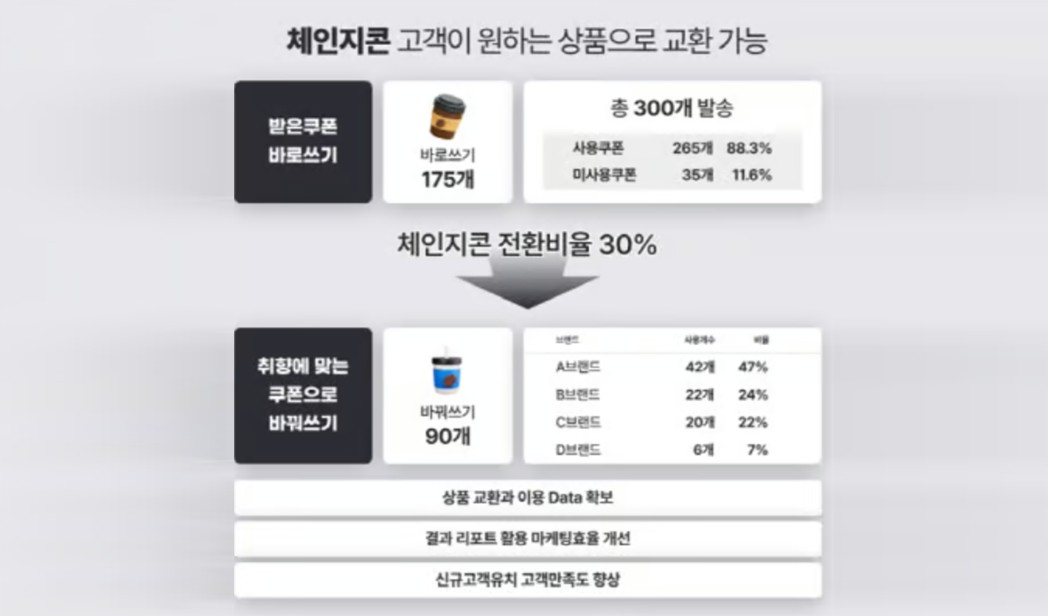 고객의 사용 편의성 향상은 물론, 기업의 마케팅 전략 강화에도 기여한다. 고객의 쿠폰 교환 행동을 데이터로 분석해 고객이 실제로 필요로 하는 상품을 파악할 수 있도록 돕는다. 이 데이터는 기업의 향후 경품 제공이나 타깃 마케팅 캠페인에 활용할 수 있어 효율적인 고객 유치 및 로열티 강화가 가능하다. 또한 API를 통해 다양한 디지털 플랫폼과 연동이 가능하며, 이를 통해 각 기업은 자사의 마케팅 플랫폼과 쉽게 통합할 수 있다.
