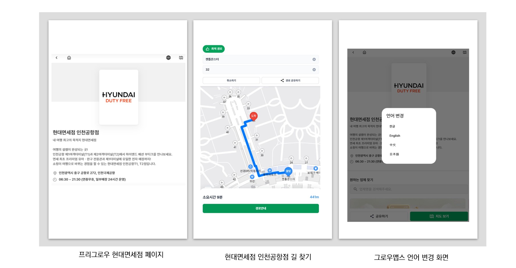Dans ce banc d'essai, en collaboration avec Hyundai Duty Free, Grow Maps est appliqué à la succursale du Hyundai Duty Free Trade Center et aux succursales T1 et T2 de l'aéroport international d'Incheon, afin que les visiteurs puissent recevoir un guidage d'itinéraire intérieur et diverses informations sur les avantages en scannant le code QR.
