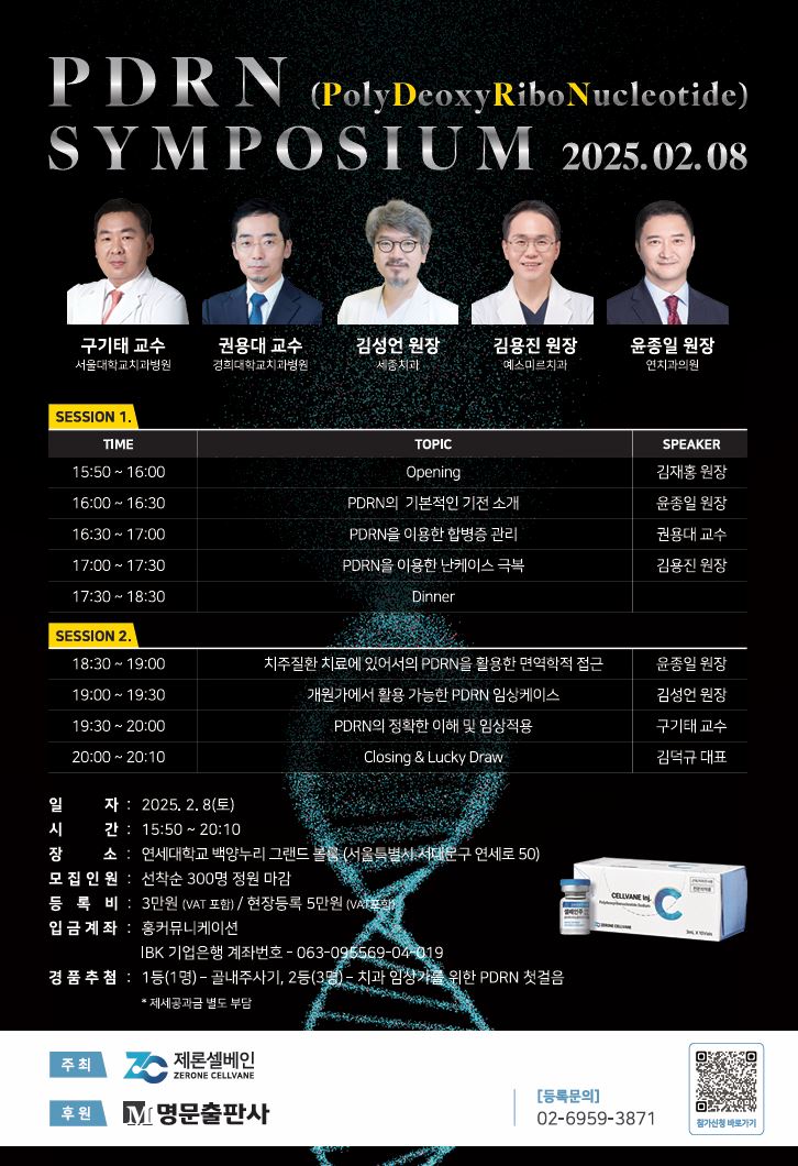 각 연자는 ▲PDRN의 기본적인 기전 소개 ▲PDRN을 이용한 합병증 관리 ▲PDRN을 이용한 난케이스 극복 ▲치주질환 치료에 있어서의 PDRN을 활용한 면역학적 접근 ▲개원가에서 활용 가능한 PDRN 임상케이스 ▲PDRN의 정확한 이해 및 임상적용 등을 심도 있게 전달할 예정이다.