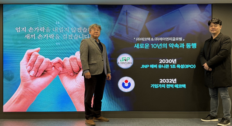 ㈜에코텍은 유니콘 빌더 투자사인 ㈜제이엔피글로벌에 두 번째 투자를 결정했다고 밝혔다. 이번 투자는 2022년 첫 번째 투자 이후 진행된 후속 투자로, 제이엔피글로벌이 유니콘 빌더로서 보여준 성과와 가치를 인정받아 이뤄진 것이다.