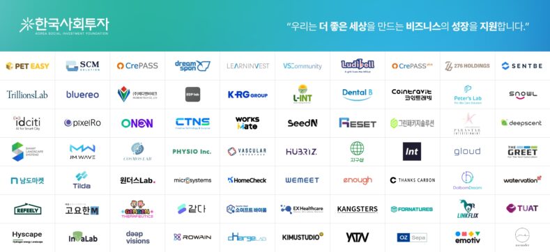 한편 한국사회투자는 2012년 설립된 공익법인 임팩트투자사로서 사회문제를 해결하는 스타트업, 사회혁신조직에게 투자, 액셀러레이팅, ESG컨설팅 등을 제공하고 있다. 기후테크, 사회서비스, 애그테크, 글로벌 분야 투자 및 액셀러레이팅에 강점을 갖고 있으며, 현재까지 총 698억원의 누적 임팩트투자금(융자, 투자, 그란트 등)을 집행했다. 주요 파트너로는 서울시, 국민건강보험공단, 한국전력공사, 한국국제협력단, 기술보증기금, 글로벌 코카콜라 재단, 현대오토에버, 아시아 벤처 필란트로피 네트워크(AVPN) 등이 있다.
