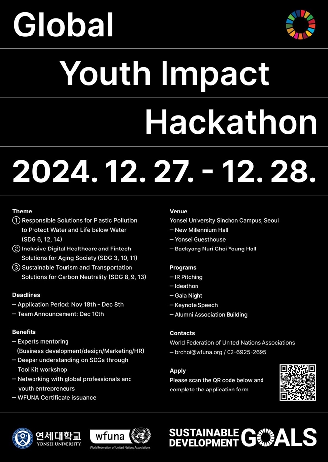 유엔협회세계연맹(World Federation of United Nations Associations, WFUNA)은 2024 글로벌 유스 임팩트 해커톤(Global Youth Impact Hackathon)이 12월 27일부터 28일까지 개최한다고 밝혔다. 이번 행사는 WFUNA와 연세대학교가 공동 주최하며, 중국남방항공이 후원한다.