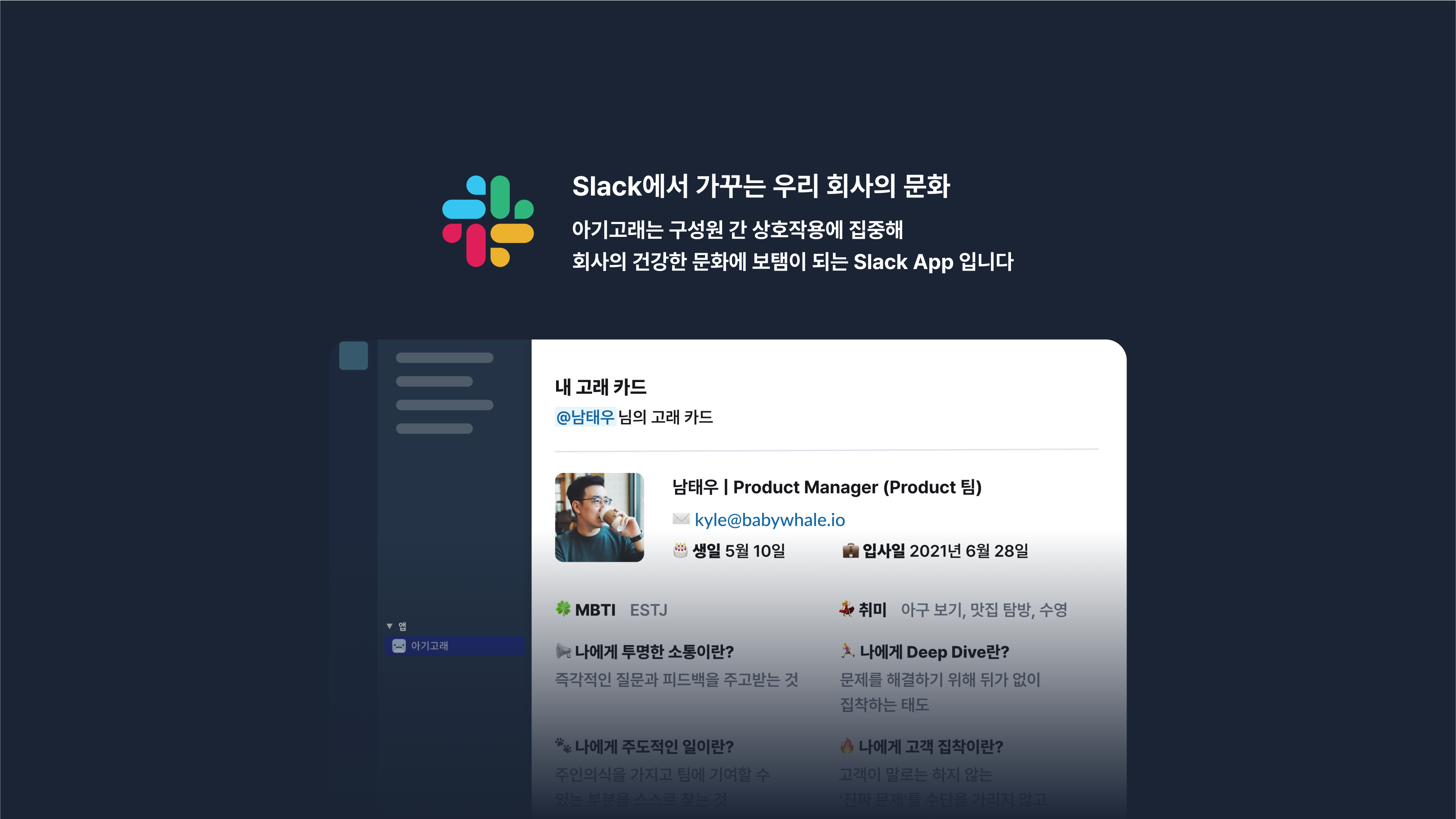 아기고래는 조직문화 활성화를 위한 기업용 커뮤니케이션 솔루션으로, 특히 인정과 축하 등의 소통을 촉진하는 기능에 집중하고 있다. 주요 고객으로는 커머스, 플랫폼 등 고객과 빈번하게 대면하고 빠른 피드백과 시도를 중요시하는 기업들이 있으며, 프로필 카드와 랜덤 커넥트 기능을 통해 사내 문화 제도를 자동화하여 구성원들의 참여를 자연스럽게 유도하고 있다. 아기고래는 기업용 메신저인 Slack을 기반으로 운영되며, 센트비, 라포랩스, 바로고, 강남언니 등이 주요 고객사로 포함된다.