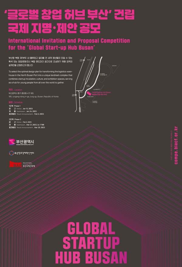 ‘글로벌 창업허브 부산’은 지난해(2024년) 7월 중소벤처기업부 공모사업으로 선정됐으며, 이번 공모는 시와 부산창경이 주최하고, 사단법인 부산국제건축제 조직위원회가 공모 운영 관리를 맡아 진행한다.