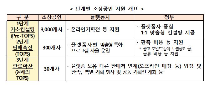 In the final third stage, we plan to select 30 'TOPS of the Year' companies and provide support for small business owners to grow into small businesses through special exhibitions and offline pop-up stores. In addition, in addition to government support, private platform companies, which are implementing organizations, will also provide customized specialized programs that they have organized on their own to the selected small business owners.