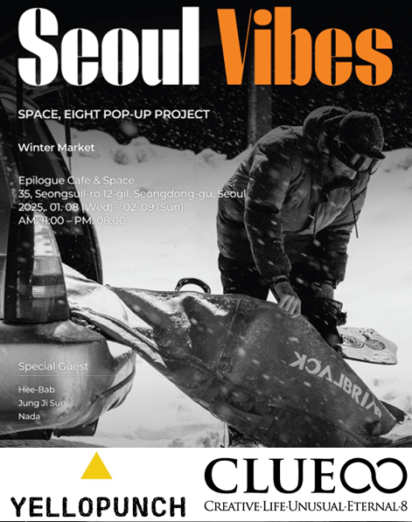 겨울 익스트림 스포츠를 테마로 한 ‘Seoul Vibes(서울 바이브)’ 아웃도어 팝업 행사가 성수동 에필로그 카페 & 스페이스(서울 성동구 성수일로 12길 35, 1층)에서 2025년 2월 9일까지 운영된다. 이번 행사는 스타트업 아웃도어 브랜드의 판로 개척을 지원하기 위해 마련된 행사다. 행사는 ㈜클루에이트와 ㈜옐로펀치가 공동 주관했다.