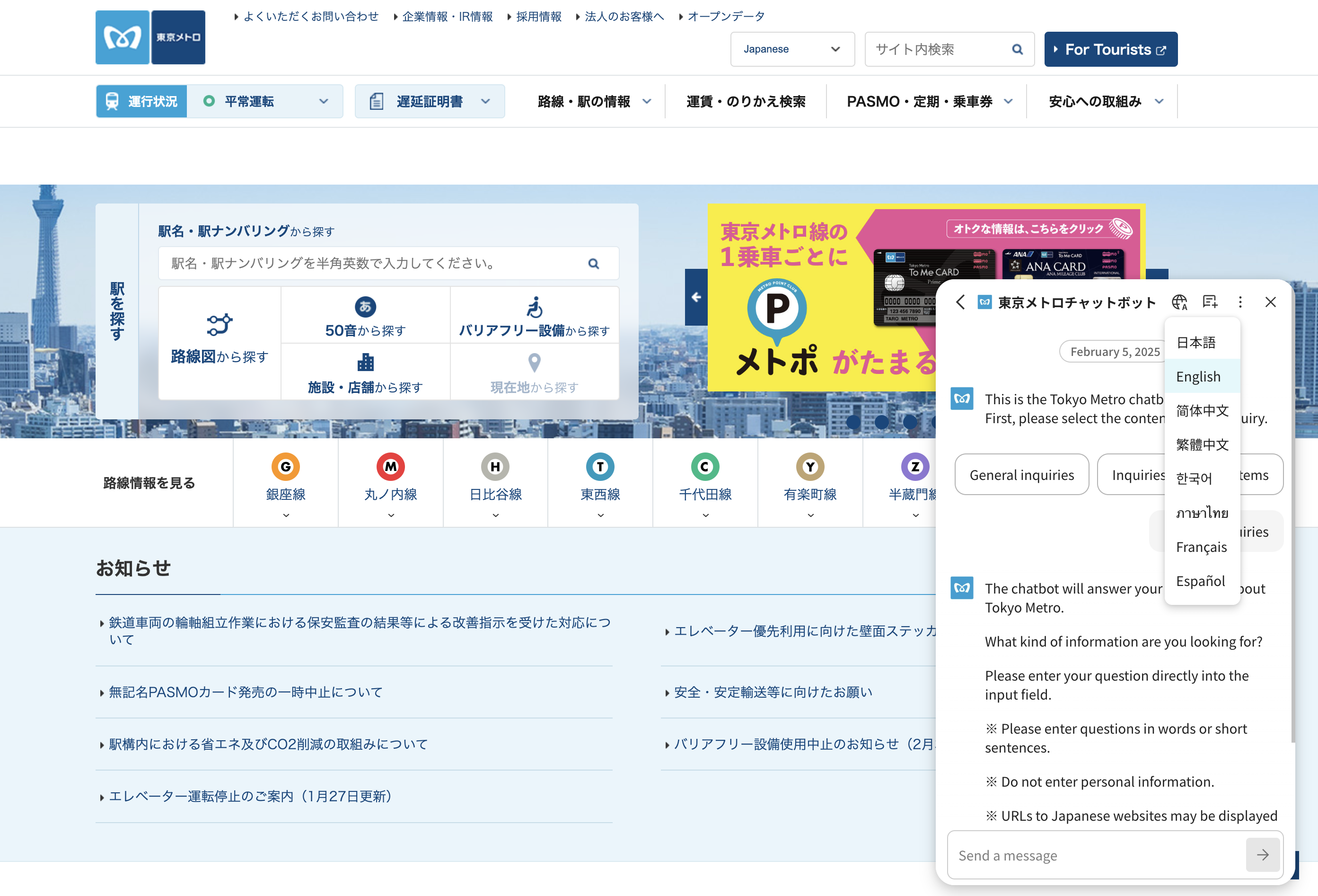 新しく導入されたチャットボットは、よくある質問に対する既存の回答を超えて、AIが東京メトロの公式ウェブサイトや社内データに基づいて情報を検索して自動的に回答を生成する。オールナイズ独自のRAG技術により、表や手書きの文書も理解でき、最適化された回答を提供する。また、チャットボットは日本語、英語、韓国語を含む8つの言語に自動的に翻訳される。