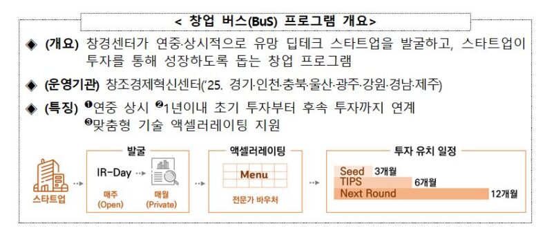 Startup-BuS aims to discover promising local startups and provide rapid support through seed investment within 3 months, TIPS within 6 months, and follow-up investment within 12 months.