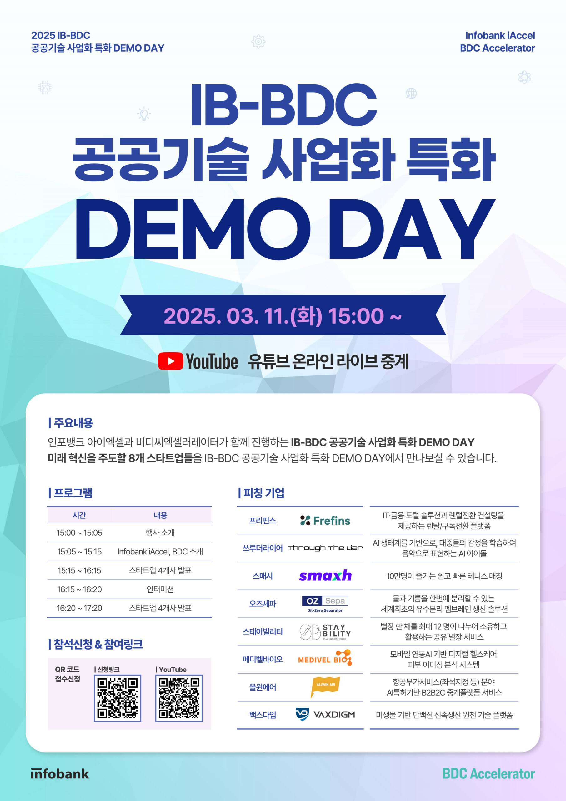 This event is evaluated as an important opportunity for startups based on public technology to commercialize their research and development results and lay the foundation for business expansion. Infobank and BDC Accelerator stated, “Through this Demo Day, we will do our best to help public technology be integrated with industry to lead to tangible results and create an environment where promising startups can continue to grow,” and “We plan to continue to provide multifaceted support so that technology-based companies can stably settle into the market and become competitive.”