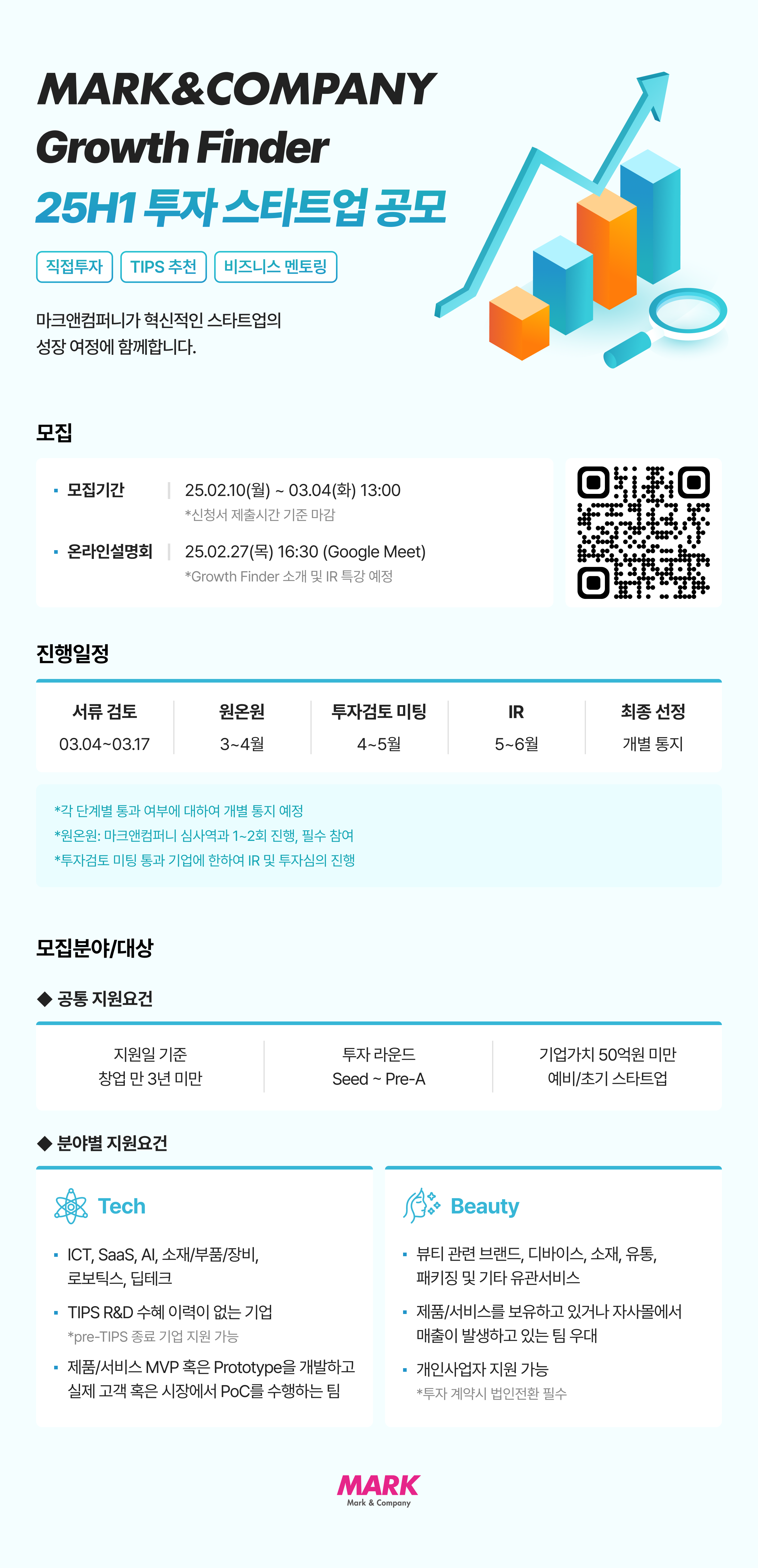스타트업 전문 투자사 마크앤컴퍼니는 2025년 상반기 투자 프로그램인 ‘MARK&COMPANY Growth Finder 25H1 투자 스타트업 공모’를 통해 유망한 초기 스타트업을 모집한다고 24일 밝혔다. 올해로 3회를 맞이하는 이번 프로그램은 테크와 뷰티 분야의 창업 3년 미만 초기 스타트업을 발굴해 최대 5억 원 이내의 투자와 일반형 및 딥테크 팁스(TIPS) 추천, 성장지원 등을 제공한다.