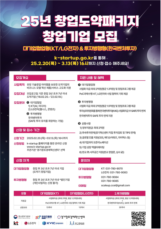 The 'Startup Leap Package (Large Business Collaboration Type)' provides up to 200 million won in commercialization funds, with an average of 130 million won. The KT track recruits companies in the AI/Cloud, ICT Convergence, and Media/Content fields, while the LG Electronics track recruits companies in the wellness and digital content fields. It is expected that collaboration with large corporations will support the growth of startups and help them make a leap forward.
