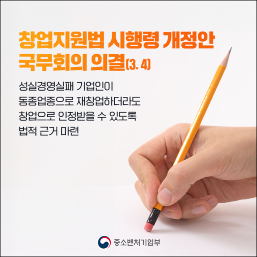 The Ministry of SMEs and Startups (Minister Oh Young-joo, hereinafter referred to as the Ministry of SMEs and Startups) announced on the 4th that it had passed a partial revision of the 'Enforcement Decree of the Small and Medium Enterprise Startup Support Act' at the Cabinet meeting to expand the scope of recognition as a start-up even if an entrepreneur who has failed in management due to conscientious management starts a new business in the same industry.