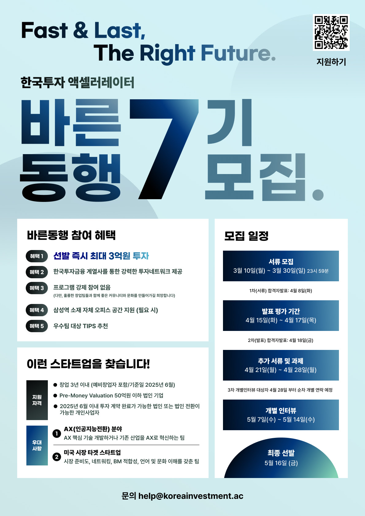 韓国投資アクセラレータは、初期スタートアップの成長を支援する「正しい同行7期」プログラムに参加するイノベーションスタートアップを募集すると10日明らかにした。今回の募集は1次書類受付で行われ、期間は3月10日14時から3月30日までだ。
