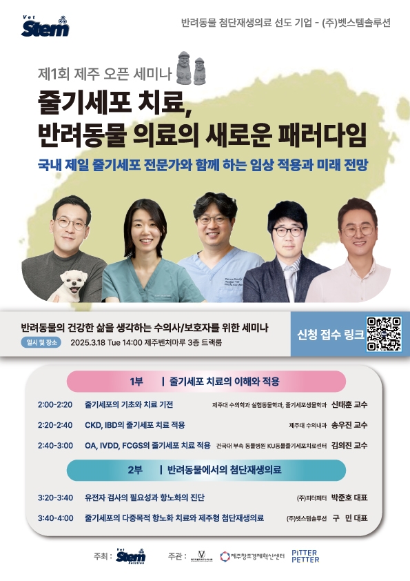 Starting with a lecture by Jeju National University Professor Shin Tae-hoon on the topic of 'Stem Cell Fundamentals and Treatment Mechanisms', Jeju National University Professor Song Woo-jin will introduce stem cell treatment applications for chronic kidney disease (CKD) and inflammatory bowel disease (IBD), and Konkuk University KU Animal Stem Cell Treatment Center Professor Kim Eui-jin will introduce stem cell treatment applications for osteoarthritis (OA), intervertebral disc disease (IVDD), and feline chronic gingivostomatitis (FCGS).