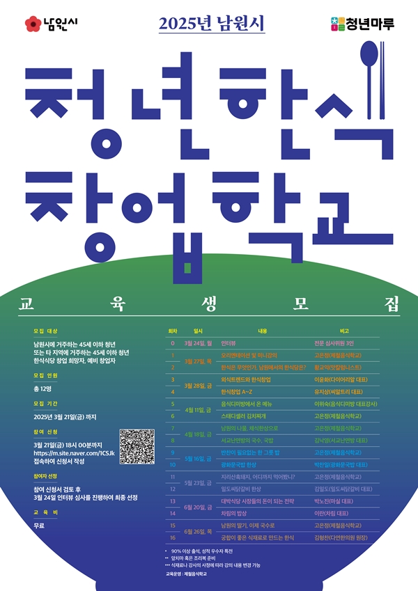 Namwon City (Mayor Choi Kyung-sik) and Namwon Youth Maru announced that they are recruiting students for the '2025 Youth Korean Food Entrepreneurship School' targeting young people who wish to start a Korean restaurant.