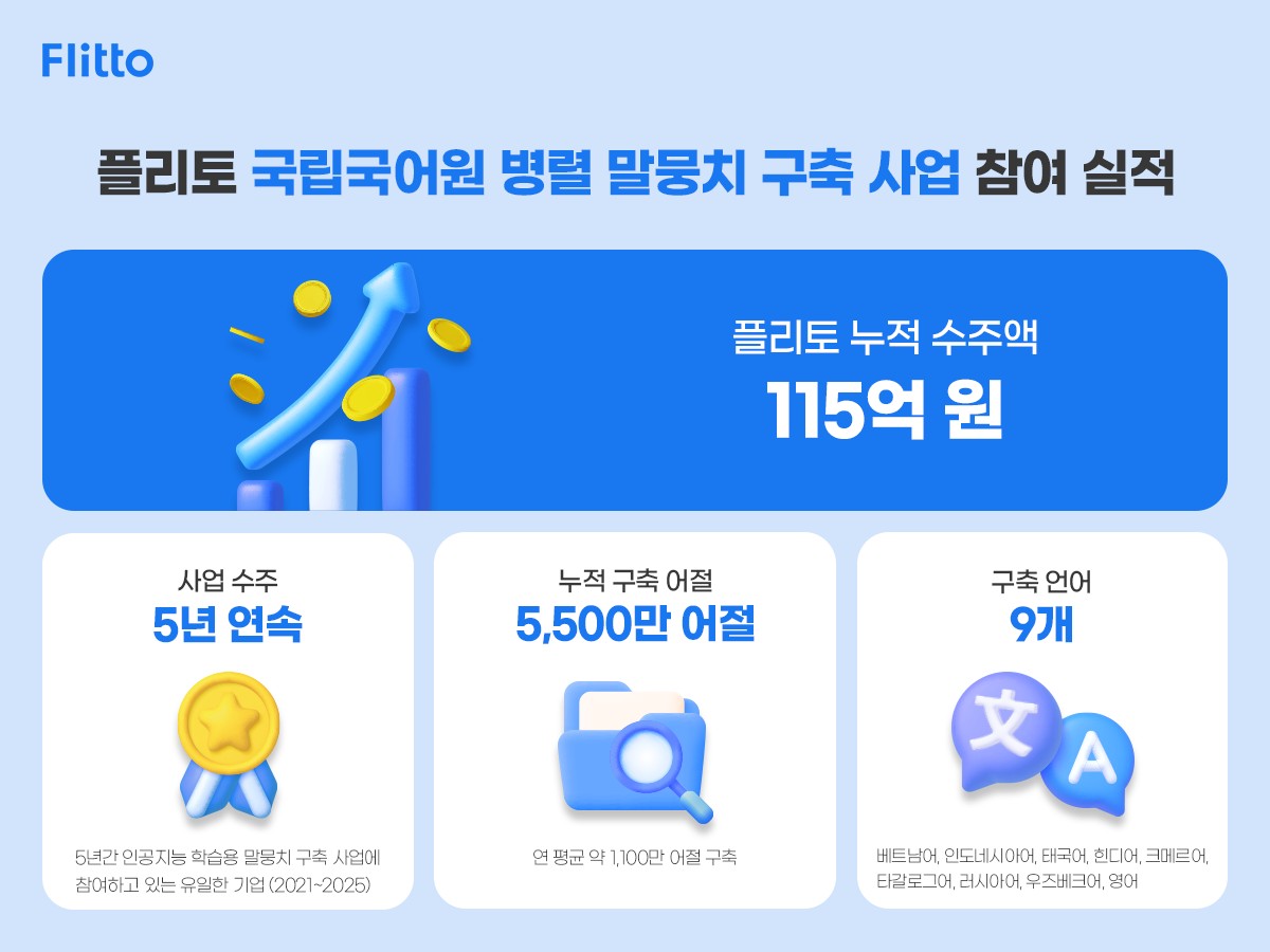 플리토는 2021년부터 현재까지 5년 연속 이 사업을 수행하며, 총 115억 원의 수주액과 5천5백만 개의 어절을 구축한 실적을 기록했다. 올해 사업은 경희대학교 산학협력단과 협력하여 진행되며, 총 42억 원 규모의 사업 중 플리토는 20억 9천만 원 규모의 병렬 말뭉치 구축을 맡았다. 이번 사업에서는 베트남어, 인도네시아어, 태국어, 힌디어, 크메르어, 타갈로그어, 러시아어, 우즈베크어, 영어 등 9개 언어에 대해 총 900만 어절의 병렬 말뭉치를 구축할 예정이다.