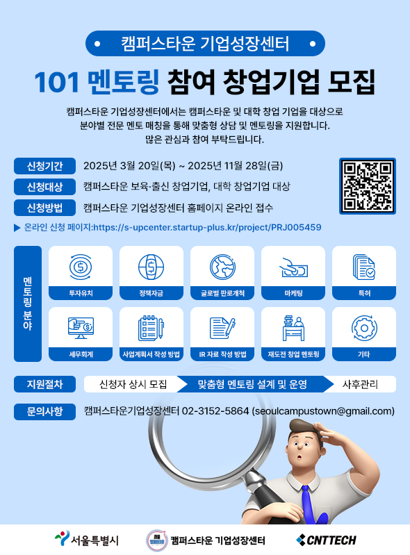 The Seoul Metropolitan Government and investment accelerator CNT Tech Co., Ltd. (CEO Jeon Hwa-seong) announced that they will be operating the '101 Mentoring' mentoring program year-round at the Campus Town Business Growth Center to provide ongoing mentoring and resolution to difficulties faced by young entrepreneurs.