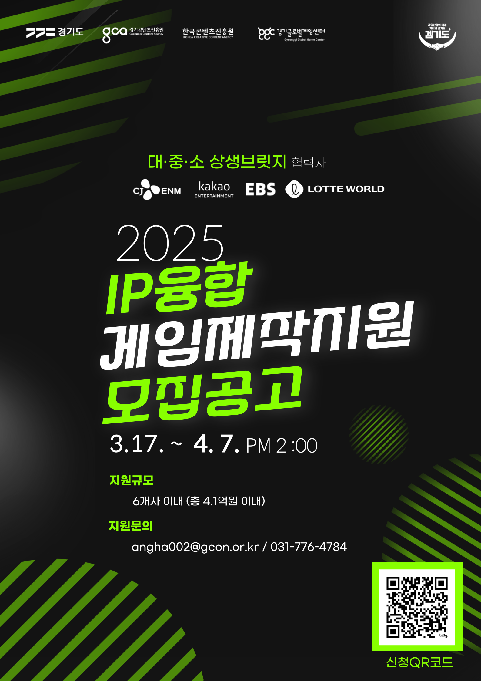 이 사업은 경기도가 대·중소기업 간 상생 협력을 위해 추진하는 ‘대중소 상생브릿지’ 사업의 일환으로, ▲CJ ENM(애니메이션‧예능‧드라마), ▲카카오엔터테인먼트(캐릭터·웹툰), ▲EBS(교육 프로그램·캐릭터), ▲롯데월드(애니메이션) 등 대기업 협력사들과 함께 진행된다. 이를 통해 중소 게임사가 안정적인 성장 기반을 마련하고, IP 기반 게임 시장에서 경쟁력을 확보할 수 있도록 지원한다.