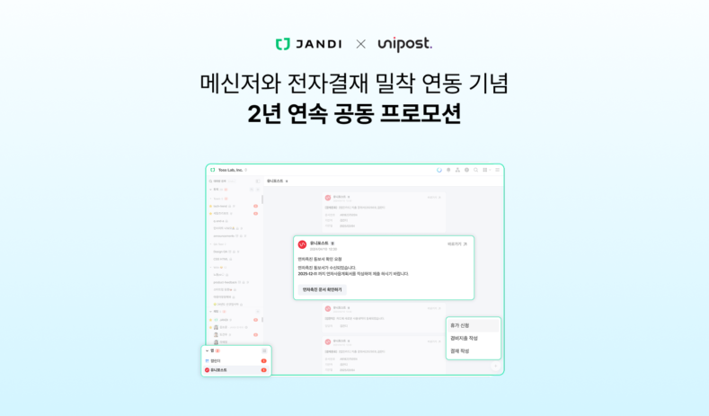Toss Lab (CEO Daehyun Kim), which provides the business collaboration tool JANDI, announced that it will hold a special promotion to commemorate the service integration with B2B SaaS service Unipost (CEO Gyewon Kim).