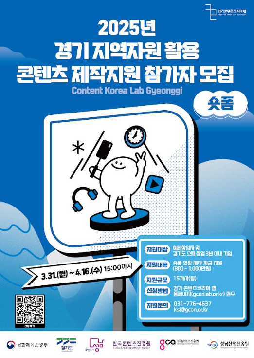 경기도와 성남시가 설립하고 경기콘텐츠진흥원(이하 경콘진)이 운영하는 경기 콘텐츠코리아 랩은 숏폼 영상 제작 역량을 보유한 창작자를 대상으로 ‘2025년 경기 지역자원 활용 콘텐츠 제작지원’ 사업 참가자를 모집한다고 7일 밝혔다. 모집은 4월 16일까지 진행되며, 본 사업은 창작자를 발굴하고 지역 고유 자원을 소재로 한 콘텐츠 제작 및 확산을 목표로 하는 프로그램이다.