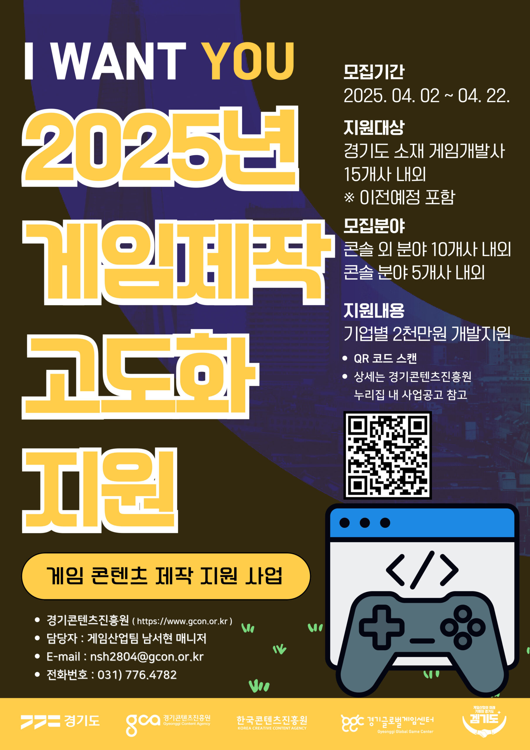 경기콘텐츠진흥원(이하 경콘진)은 도내 게임 기업의 경쟁력 강화를 위한 ‘2025년 게임 제작 고도화 지원’ 사업을 추진하고, 오는 4월 22일까지 참여 기업을 모집한다고 밝혔다.