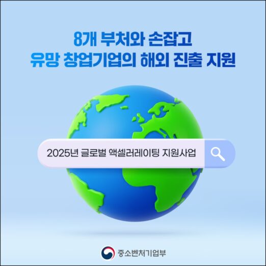 중소벤처기업부(장관 오영주, 이하 중기부)는 14일 국내 유망 창업기업의 해외 진출과 정착을 지원하는 ‘2025년 글로벌 액셀러레이팅 지원사업’의 주관기관으로 한국농업기술진흥원 등 8곳을 선정했다고 밝혔다.