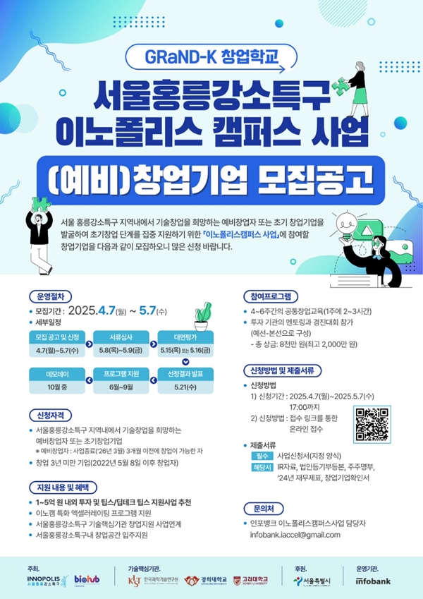 서울홍릉강소특구는 바이오, 헬스케어, 의료기기 등 첨단 기술 분야에서 연구·창업·사업화를 적극 지원하는 지역으로, 이번 이노폴리스캠퍼스 사업을 통해 예비 창업자가 아이디어를 실현하고 기술 스타트업이 초기 성장을 이루는 데 필요한 환경을 제공하고자 한다.