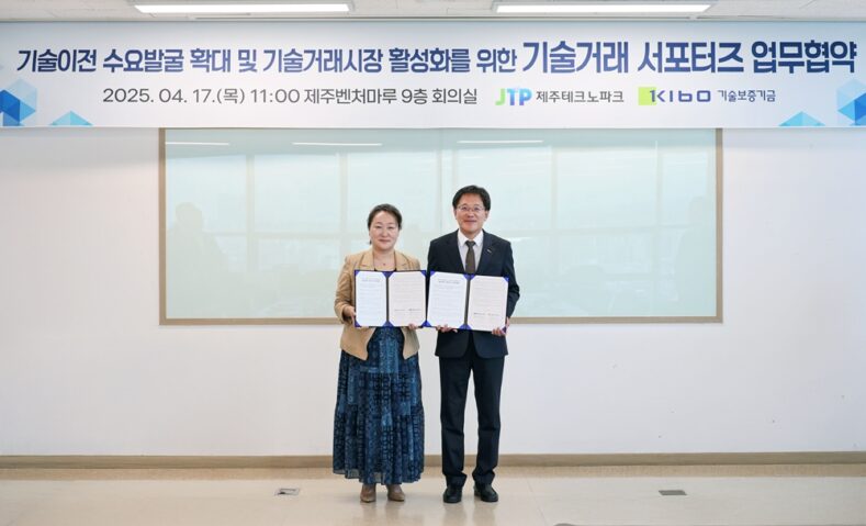 기술보증기금(이사장 김종호, 이하 기보)은 17일 제주테크노파크(원장 지영흔, 이하 제주TP)와 ‘기술이전 수요발굴 확대 및 기술거래시장 활성화를 위한 기술거래 서포터즈 업무협약’을 체결했다고 밝혔다.