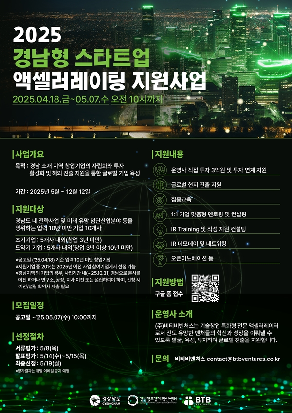BTB Ventures Co., Ltd. was selected as the operator of this project. BTB Ventures has a wide network with global startup hubs such as the US, Europe, and Singapore, and is evaluated as an accelerator with specialized capabilities for the global expansion and scale-up of Gyeongnam startups.