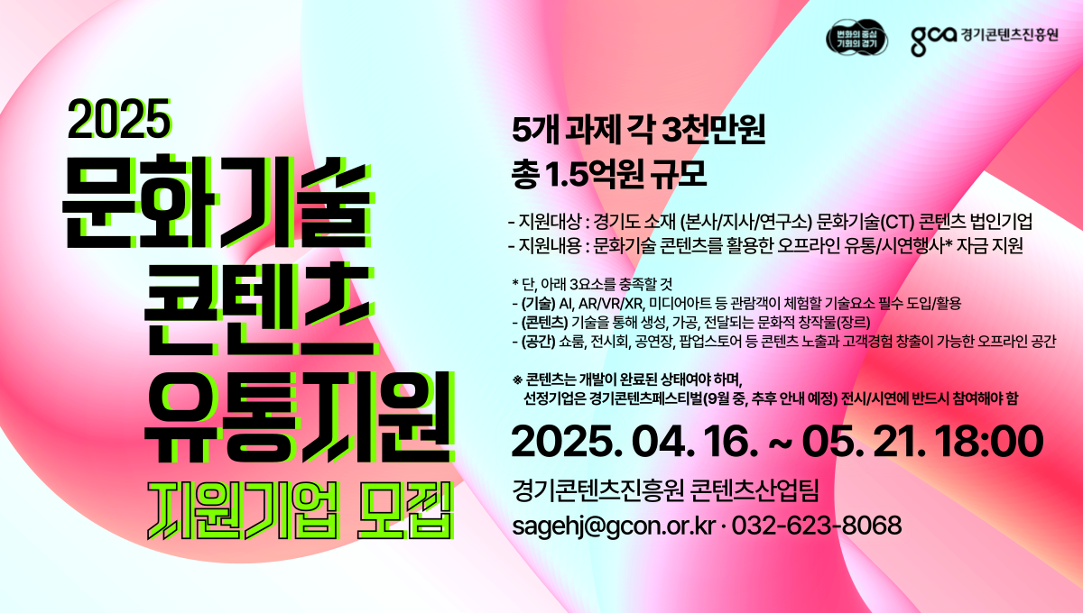 경기도와 경기콘텐츠진흥원(이하 경콘진)은 도내 문화기술 기업의 콘텐츠 유통을 지원하고 국내외 시장 진출을 촉진하기 위해 ‘2025년 문화기술 콘텐츠 유통지원’ 사업을 추진한다고 21일 밝혔다. 이번 사업은 콘텐츠 유통 자금 및 실행 지원을 통해 제작이 완료된 콘텐츠의 실질적인 사업화를 돕는 데 목적이 있다.