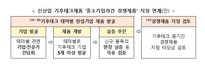 또한 2027년까지 2대 중점 육성분야부터 시작하여, 기후테크 기업을 테마별로 5개 이상씩 발굴·육성(~‘26)하여 28조원(‘23년 기준) 규모의 중소기업자간 경쟁시장 진입을 도울 계획이다.