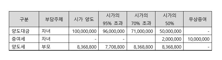 양도대금을 포함한 자녀 및 부모의 총 자금부담을 사례 별로 정리하면 다음과 같다.
