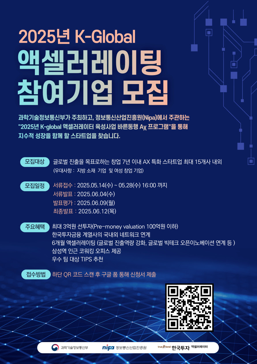 과학기술정보통신부와 정보통신산업진흥원이 주관하고 한국투자액셀러레이터가 운영하는 ‘2025년 K-Global 액셀러레이팅 사업’의 일환으로, ‘K-Global 바른동행 AX’ 프로그램이 참가 스타트업 모집을 시작했다.