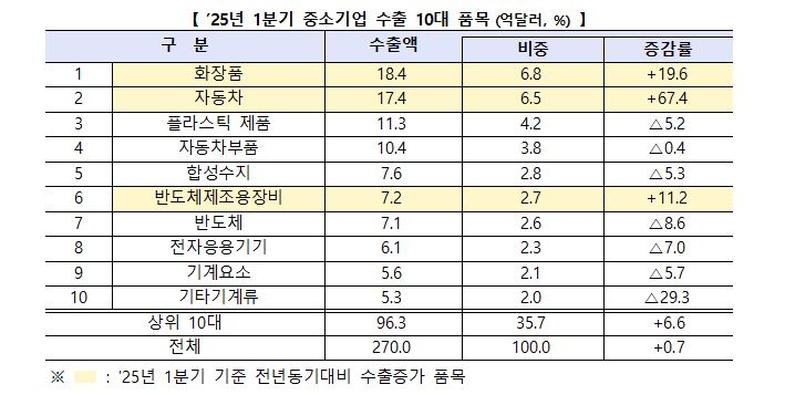 'Cosmetics (USD 1.84 billion, +19.6%) and automobiles (USD 1.74 billion, +67.4%), which ranked first and second in exports by small and medium-sized enterprises in the first quarter of 2025, recorded the highest export amounts ever in the first quarter.