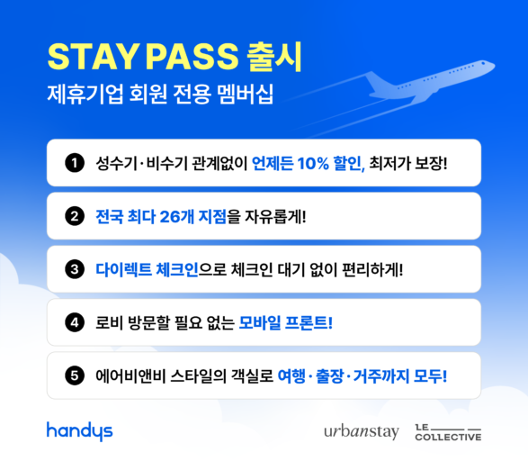 Handys, which operates the nation's number one residence hotel brand 'Urban Stay', announced on the 19th that it has launched 'StayPass', a special discount service for office workers.