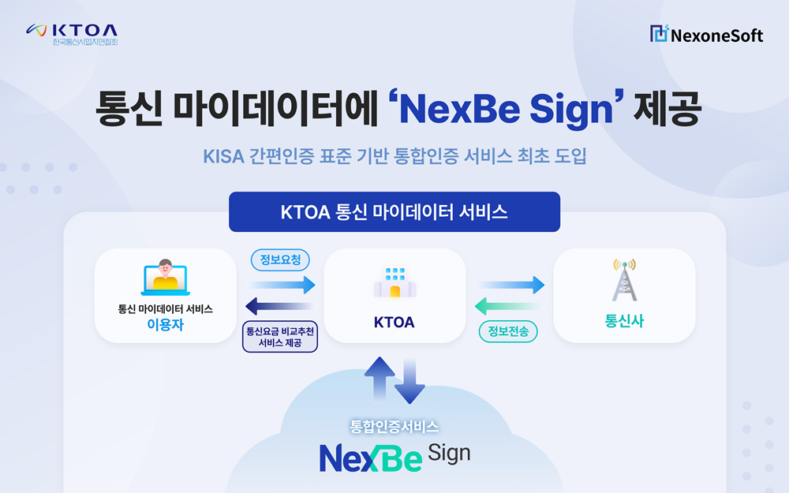 Data platform service company NexoneSoft (CEO Choi Deok-hoon) announced on the 21st that it provided the integrated authentication service 'NexBe Sign' to the Korea Telecom Operators Association's (KTOA) leading MyData service 'Telecommunications MyData'.