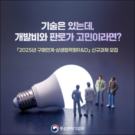 중소벤처기업부(장관 오영주, 이하 중기부)는 23일 중소벤처기업의 기술사업화를 촉진하기 위해 ‘2025년 구매연계·상생협력형R&D’ 신규과제 모집을 공고한다고 밝혔다.