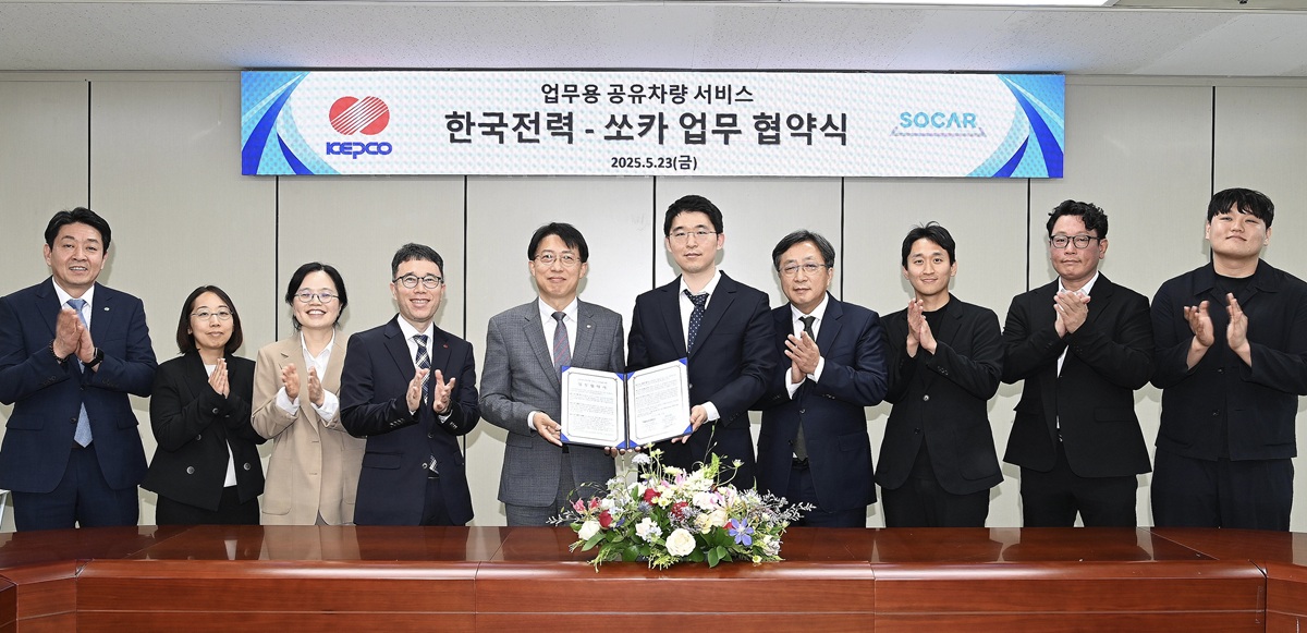 Socar Co., Ltd. announced on the 26th that it signed a business agreement (MOU) with Korea Electric Power Corporation (hereinafter referred to as KEPCO) for the ‘provision of business-use shared vehicle services.’ The agreement signing ceremony was held on the 23rd at the KEPCO Art Center in Seocho-gu, Seoul, and was attended by key officials from both companies, including Socar Chief Business Officer (CBO) Nam Goong-ho and KEPCO Vice President Ahn Joong-eun.