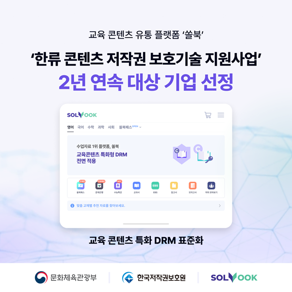 Bookipis Co., Ltd., which operates the educational content distribution platform 'SOLVOOK', announced on the 27th that it was selected for the '2025 Hallyu Content Copyright Protection Technology Application and Support Project' hosted by the Ministry of Culture, Sports and Tourism and the Korea Copyright Commission for the second consecutive year.