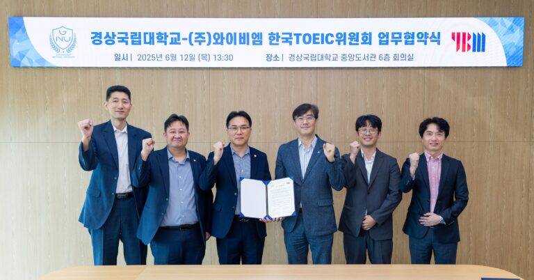 국내 교육 및 평가 전문 기관인 YBM 산하 한국TOEIC위원회는 경상국립대학교와 글로벌 역량을 갖춘 인재 양성을 위한 업무협약을 체결했다고 밝혔다. 이번 협약식은 6월 12일 경상남도 진주에 위치한 경상국립대학교 가좌캠퍼스 중앙도서관에서 개최되었으며, YBM 한국TOEIC위원회 김희준 본부장과 경상국립대학교 오재신 국제처장을 비롯한 양측 관계자들이 참석했다. 양 기관은 이번 협약을 통해 상호 보유한 교육 자원과 인프라를 공유하고, 학생들의 글로벌 역량 강화를 위한 다양한 지원 방안을 공동으로 모색할 계획이다. YBM 한국TOEIC위원회는 2024년부터 경상국립대학교 재학생을 대상으로 ‘글로벌리더 지원 프로그램’을 운영하고 있으며, TOEIC Speaking 시험 응시료 할인 혜택을 제공 중이다. 이번 협약을 계기로 TOEIC 정기시험에 대해서도 10%의 상시 할인 혜택이 추가로 적용될 예정이다. 또한, 현재 경상국립대 내에서 운영 중인 TOEIC Speaking 공인시험센터의 확대 운영을 통해 시험 환경 개선도 추진된다. 경상국립대학교는 TOEIC 및 TOEIC Speaking 시험을 교내 해외파견 프로그램, 어학 장학금, 교환학생 선발, 졸업 인증요건 등 다양한 제도에 활용하고 있으며, 양 기관은 향후 글로벌 경쟁력을 갖춘 인재 양성을 위한 협력을 지속적으로 강화해 나갈 방침이다. 한국TOEIC위원회 김희준 본부장은 “이번 협약을 통해 학생들의 외국어 역량 강화는 물론, 실질적인 취업 경쟁력 제고에 기여할 수 있도록 적극 지원하겠다”고 밝혔다. 관련 기사 더보기 https://www.venturesquare.net/909195