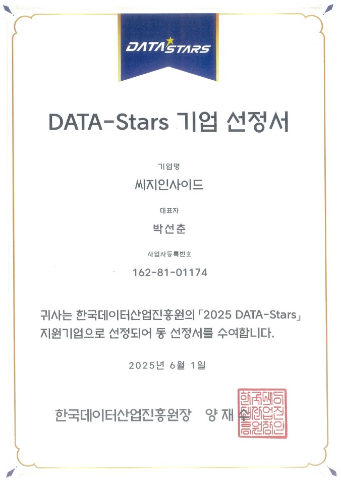 데이터 기반 인공지능 솔루션 기업 ㈜씨지인사이드는 과학기술정보통신부가 주최하고 한국데이터산업진흥원이 주관하는 ‘2025 DATA-Stars’ 지원 사업에 최종 선정됐다고 16일 밝혔다.