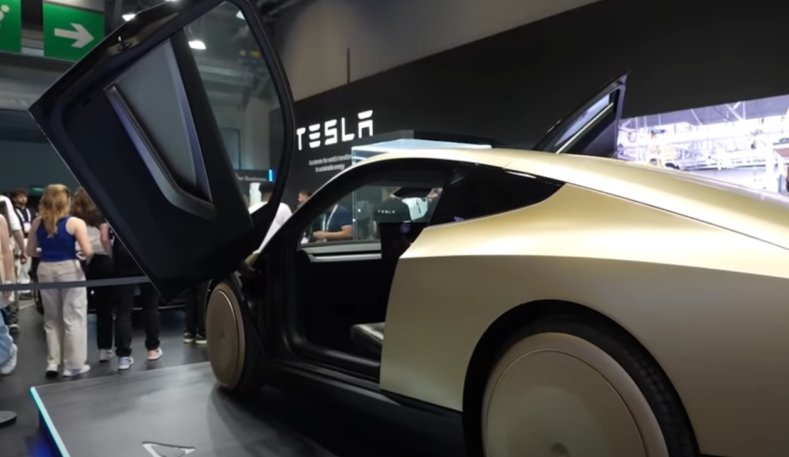 < Spectators look at Tesla's futuristic robotaxi 'Cybercap' without a steering wheel or pedals >