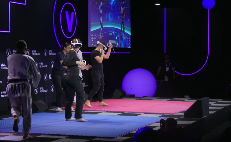 < Les participants font une démonstration de « taekwondo virtuel » en utilisant la technologie de réalité virtuelle (RV) lors de l'événement VivaTech.>