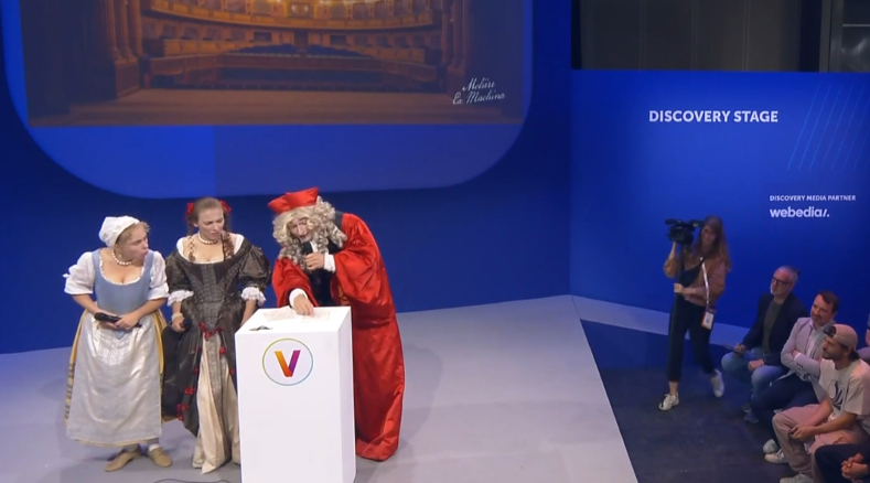 < Stage of the play 'Molière Ex Machina' co-written by AI and humans>
