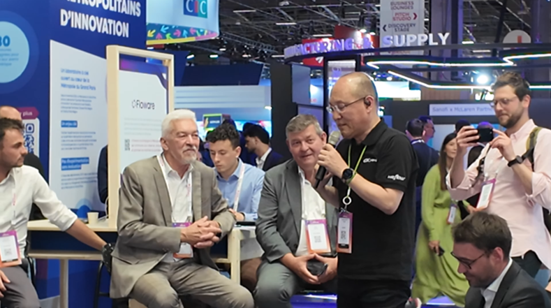 < 이플로우 대표가 VivaTech 현장에서 ‘소형 수소 충전 인프라’ 시범 사업자 선정을 기념하며 소감을 발표하고 있다>