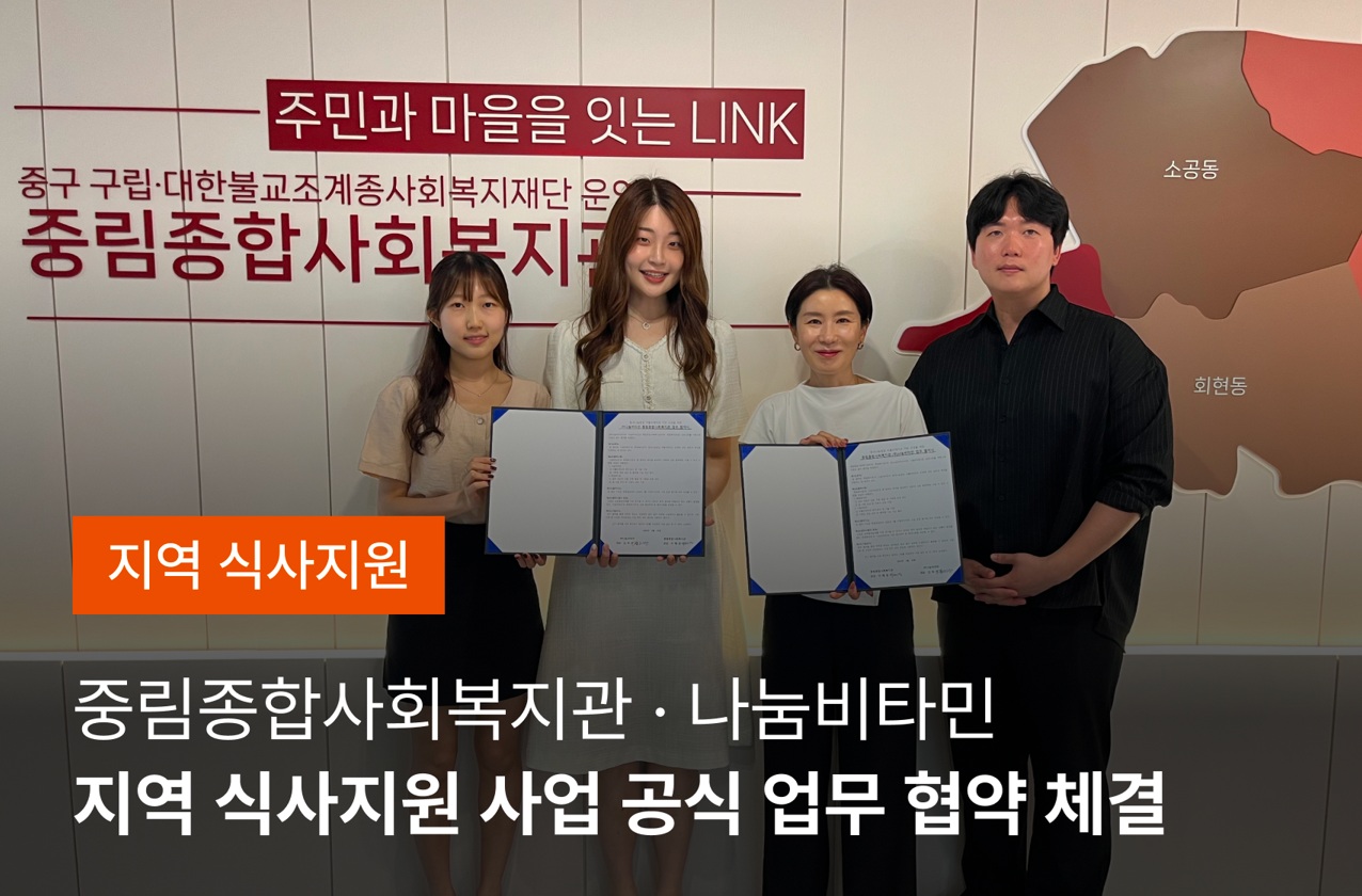 ICT 기반 사회공헌 솔루션 기업 ㈜나눔비타민(대표 김하연)은 지난 6월 중림종합사회복지관(관장 이해경)과 지역 식사지원 사업 ‘동네나눔밥집’의 디지털 전환을 위한 업무협약(MOU)을 체결했다고 11일 밝혔다.